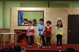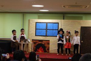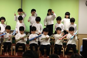 お楽しみ会は幼児組のりんご組さん、ぶどう組さん、れもん組さんによる作品展と劇、合奏、合唱の発表をする日です。