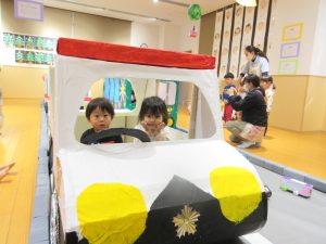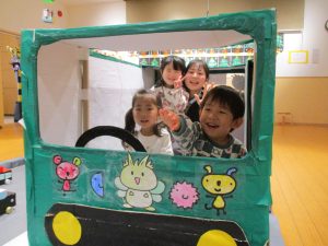 作品展のテーマは「走り続ける・みんなの夢をのせて」です。作品は幼児組さんのものですが、乳児組さんもお客さんとして作品展を楽しみました。